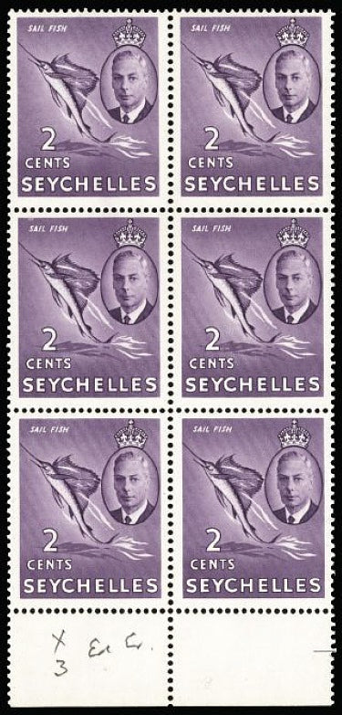 £140.00| /Seychelles 1952 2c lilac, lower marginal block of 6 (2x3) with part centre guide, showing watermark error 'St. Edward's Crown' (W9b) on top left st...