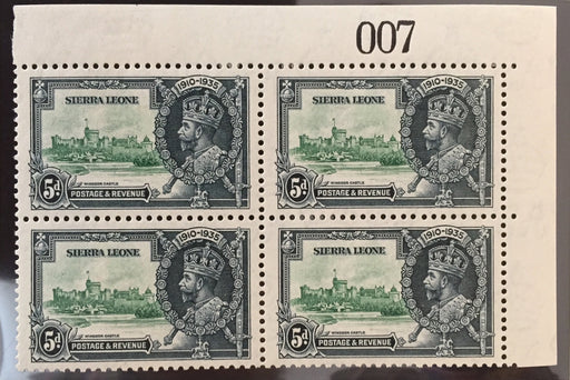 £225.00| /Sierra Leone 1935 Silver Jubilee 5d green and indigo, upper right corner block of 4 with sheet number '007' from vignette plate '3', showing variet...