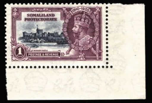 £195.00| /Somaliland 1935 Jubilee 1r slate and purple, lower right corner example from vignette plate '2A', showing variety 'Kite and vertical log', brillian...