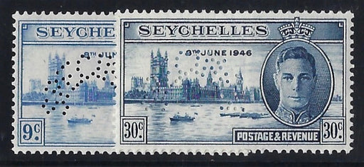 £75.00| /Seychelles 1946 Victory 9c and 30c, perforate 'SPECIMEN' (type D21), very fine original gum. Specimen. SG 150s/1s ALERT ME WHEN ANOTHER IS AVAILAB...