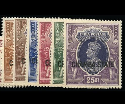Sold out Sold outI.C.S. Chamba 1938 Mint "CHAMBA STATE" set of 18 to 25r SG82/99£495.00| /1938 "CHAMBA STATE" set of 18 to 25r, part to large part original gum. A little heavily hinged in places, with a couple of imperfections (6a thin s... View full details£495.00| /Sold out