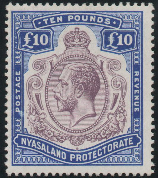 Sold out Sold outNyasaland 1913-19 £10 Purple and Royal Blue, Mint SG99e£3,600.00| /Nyasaland 1913-19 £10 Purple and Royal Blue, SG99e. A very fine mint example of this scarce and attractive high value stamp. SG catalogue price is ... View full details£3,600.00| /Sold out