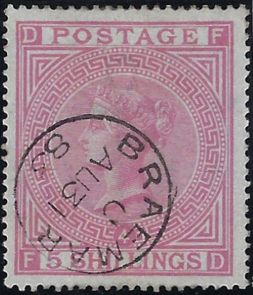 £4,800.00| /Great Britain 1882 5s Rose Plate 4 (Blued paper), SG130. A very fine used well centred example lettered FD, neatly cancelled by a Braemar circular...