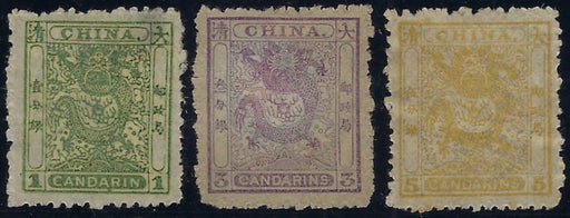 £600.00| /China 1885 'CANDARINS' rough perforations 12 1/2 set of 3 to 5ca olive-yellow, SG10/12. Despite odd trivial tone, excellent colours and large part...