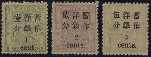 £1,125.00| /China 1897 small figure surcharges on 'small dragons', set of 3 to 5c on 5ca olive-yellow, SG34/36. Mint set of 3 in fine quality, with large part...