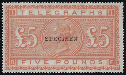 £2,800.00| /Great Britain 1877 Telegraph £5 Orange Plate 1, SGT18s. A very fine unused original gum example lettered BF, overprinted "SPECIMEN" type 9. Scarce...