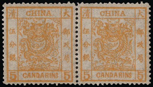 £3,800.00| /China (Unused) 1878-83 'CANDARIN' thin paper, 21/2mm spacing 5ca orange, SG3. A fine quality horizontal pair which is fresh and well centred, larg...