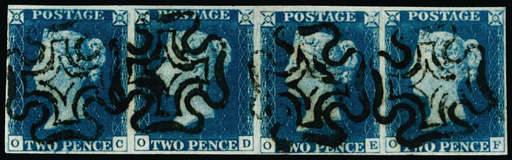 £5,000.00| /Great Britain 1840 2d Blue 1840 2d Blue Plate 1, SG5. A very fine used close to large four margin horizontal strip of four lettered OC-OF showing ...