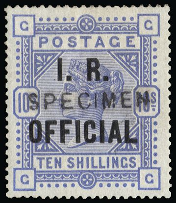 £4,500.00| /Great Britain Officials (Official-M) 1885 10s Cobalt (I.R. Official, blued paper), SGO9cs. A very fine, well centred unused original gum example ...