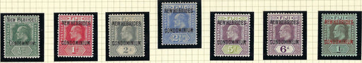 Sold out Sold outNew Hebrides 1910 King George V (15 Dec) SG10/16£10.00| /New Hebrides King George V 1910 (15 Dec) of Fiji overprinted with "NEW HEBRIDES" and "CONDOMINIUM" by De La Rue, ordinary paper (½d to 2½d) or cha... View full details£10.00| /Sold out