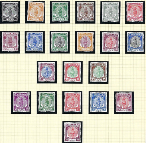 Sold out Sold outMalaysian States Kelantan 1951-55 'Sultan Ibrahim' chalk surfaced paper, Watermark Multiple Script CA, 1c to $5 green and black set of 21, SG61/81.£120.00| /Malaysian States Kelantan 1951-55 'Sultan Ibrahim' chalk surfaced paper, Watermark Multiple Script CA, 1c to $5 green and black set of 21, SG61/81.... View full details£120.00| /Sold out