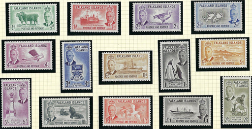 Sold out Sold outFalkland Islands 1952 (2 Jan) King George VI set of 14, SG172/185.£150.00| /Falkland Islands King George VI 1952 (2 Jan) Watermark Multiple Script CA, ½d to £1 black set of 14. A very fine quality lightly hinged mint set wi... View full details£150.00| /Sold out