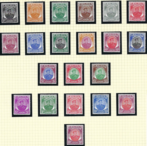 £140.00| /Malaysian States Johore King George VI 1949-55 'Sultan Sir Ibrahim' 1c to $5 green and brown set of 21, SG133/147. Watermark Multiple Script CA, c...