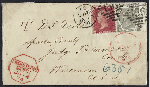 £1,000.00| /Great Britain 1874 Transatlantic mail, SG43,125. A very fine registered cover sent from Cork to Wisconsin, USA. Sent per Cunard steamer "Parthia" ...