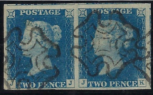 £2,000.00| /Great Britain 1840 2d pale blue Plate 1, SG6. A very fine used good to huge four margin horizontal pair lettered 'JJ-JK', neatly cancelled by cri...