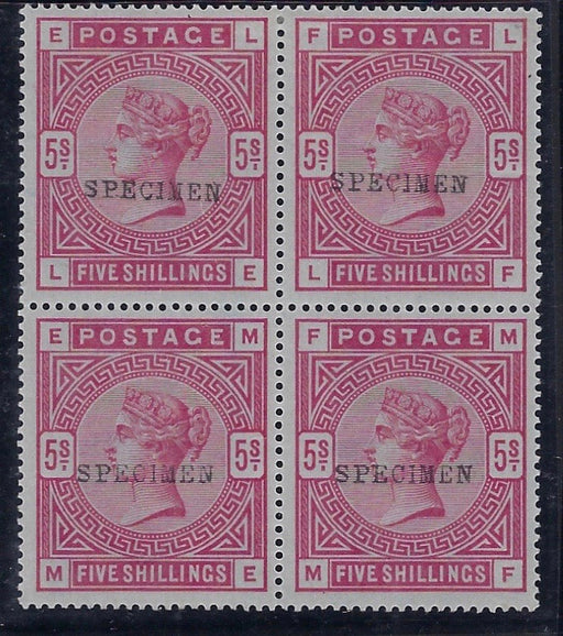 £6,750.00| /Great Britain 1884 5s Rose (Blued paper), SG176s. Very fine unused original gum block of four lettered LE-MF overprinted 'SPECIMEN' type 9, SG176s...