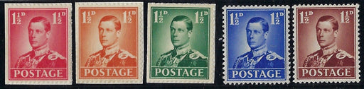 £7,500.00| /Great Britain 1936 1½d Edward VIII Coronation essays, SG459var. Very fine set of 5 perforated essays in red, orange, green, blue and brown, showin...