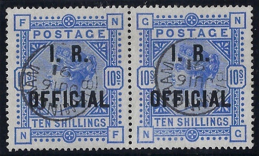 £9,000.00| /Great Britain 1890 10s Ultramarine (I.R. Official), SGO10b. Superb used horizontal pair overprinted in blue-black (white paper) lettered NF-NG, b...