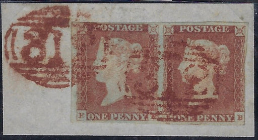 £12,000.00| /Great Britain 1841 1d Red-brown Plate 132, SG8p. Very fine used horizontal pair lettered EA-EB, neatly tied to a small piece by a pair of red Glo...
