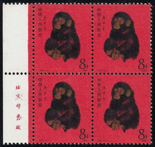 £6,950.00| /China 1980 People's Republic China (PRC) General Issues, "Year of the Monkey" 8f vermilion, black and gold, left marginal block of four with impri...
