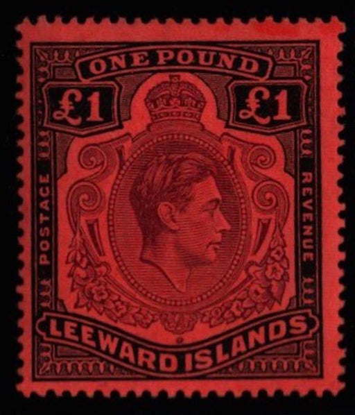 £295.00| /Leeward Islands 1938-51 £1 brown-purple and black/red, SG114. A fine and fresh mint example with only a slight hinge mark, otherwise full clean ori...