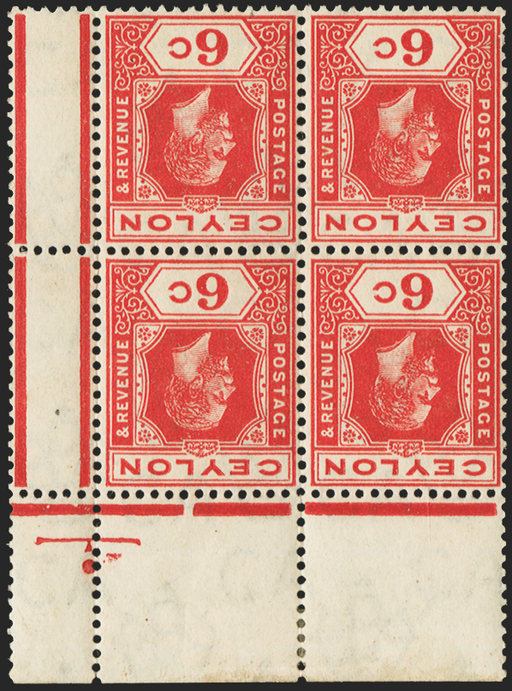 £140.00| /Ceylon 1912-25 6c pale scarlet (single plate), watermark MCA, variety watermark inverted, upper right corner block of 4 from upper left pane with c...