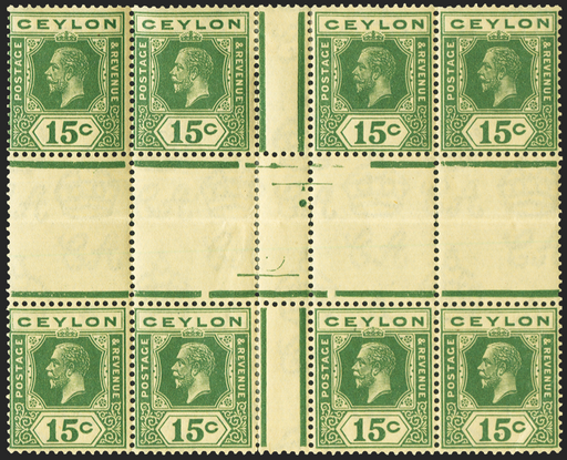 £850.00| /Ceylon 1921-32 15c green/pale yellow, Script watermark, block of 8 from the October 1924 printing combining plates '7' (upper) and '12' (lower), fr...