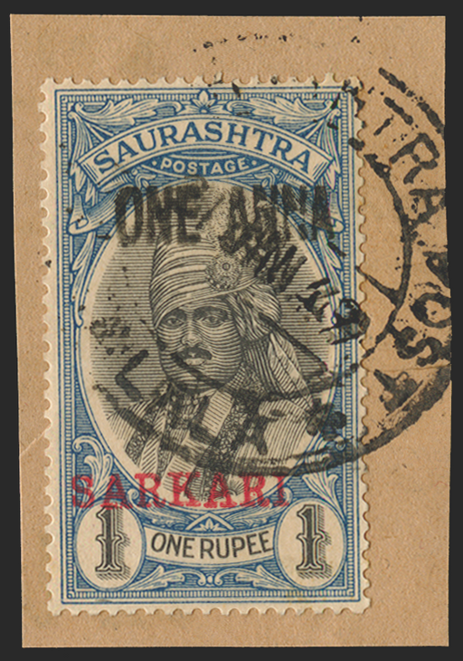 £130.00| /Indian Feudatory States Soruth 1948 'ONE ANNA' on 1r black and pale blue Official, type O3 'SARKARI', tied to piece by large part '(TA)LALA' circul...