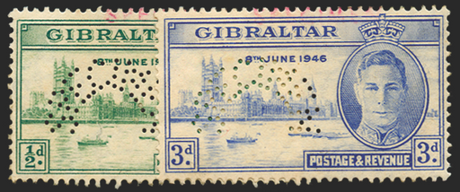 £225.00| /Gibraltar 1946 Victory ½d green and 3d ultramarine, perforated 'SPECIMEN' (type D21) and with additional red 'SPECIMEN' handstamp applied on receip...