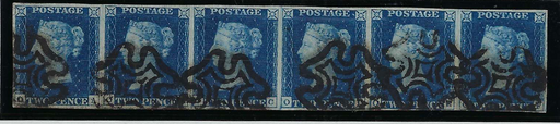£5,000.00| /Great Britain 1840 2d blue Plate 2, SG5. A very fine used close to very large four margin horizontal strip of six lettered OA-OF, each stamp neatly...