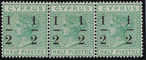£3,875.00| /Cyprus 1886 (June) '1/2' on 1/2pi emerald green, watermark CA, type 10 surcharge with 8mm spacing, horizontal strip of 3, the centre stamp with the...