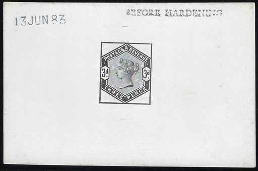 £1,600.00| /Great Britain 1883 3d Die proof, SG191var. Very fine example printed in black on white glazed card (90x60mm) without corner letters, endorsed "BEFO...