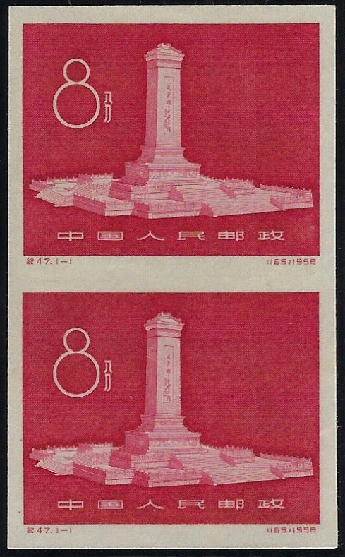 £4,250.00| /China People's Republic 1958 'Unveiling of the People's Heroes Monument' 8f carmine, SG1749. An imperforate proof in the issued colour, vertical pa...