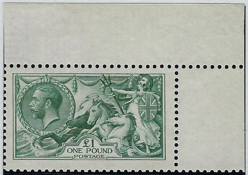 £5,250.00| /Great Britain 1913 £1 dull blue green "Seahorse", SG404. An exceptionally fine and fresh unmounted mint, with full original gum, top right hand cor...
