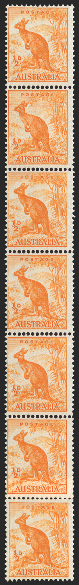 £350.00| /Australia 1948-56 ½d orange, no watermark, vertical coil strip of 7, showing the variety with prominent 'Sky retouch' (right pane, R6/8) on second ...