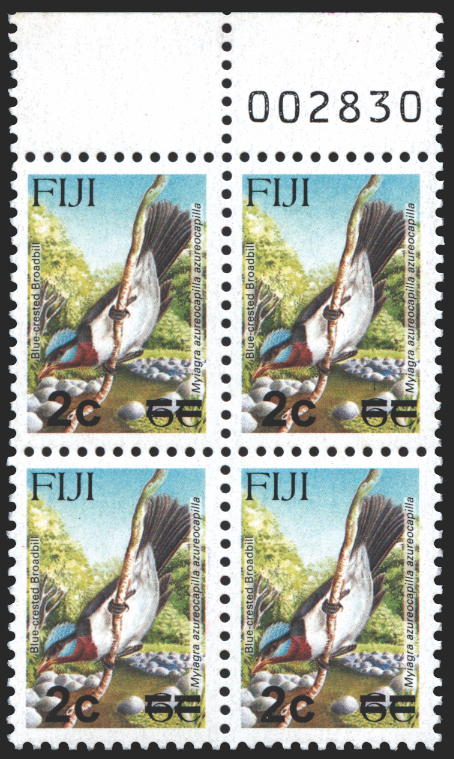 £395.00| /Fiji 2006-08 Local provisional 2c on 6c 'Flycatcher', type VI surcharge, variety "= =" for "XX", upper marginal block of 4 with '002830' sheet numb...