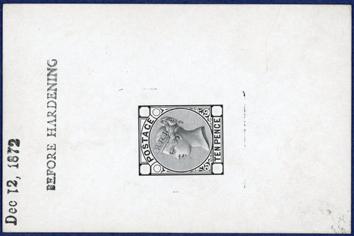 £3,750.00| /Great Britain 1872 10d die proof, SG112var. A very fine example printed in black on white glazed card (61x92mm) with corner letters and plate numbe...
