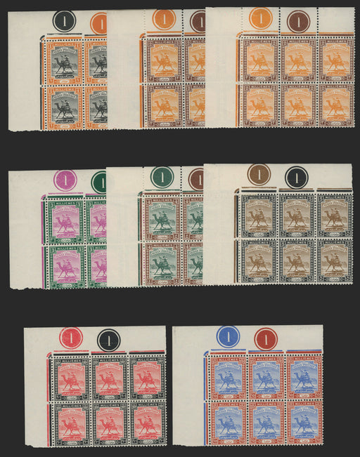 £195.00| /Sudan 1948 New Arabic six values (1, 2, 3, 5, 10, 15m), matching upper left corner blocks of 6 (3x2) with plate numbers '1' (x2), each with R2/3 'n...