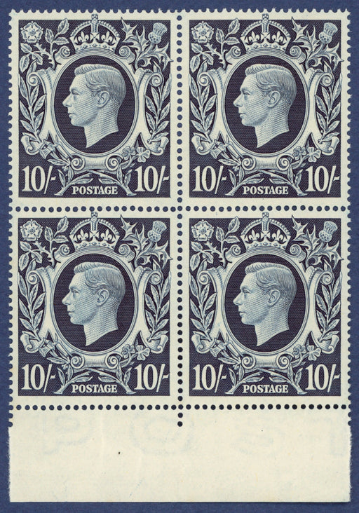 £850.00| /Great Britain 1939 10s. dark blue, SG478. A fine unmounted mint bottom marginal block of four. A scarce and most attractive King George VI position...