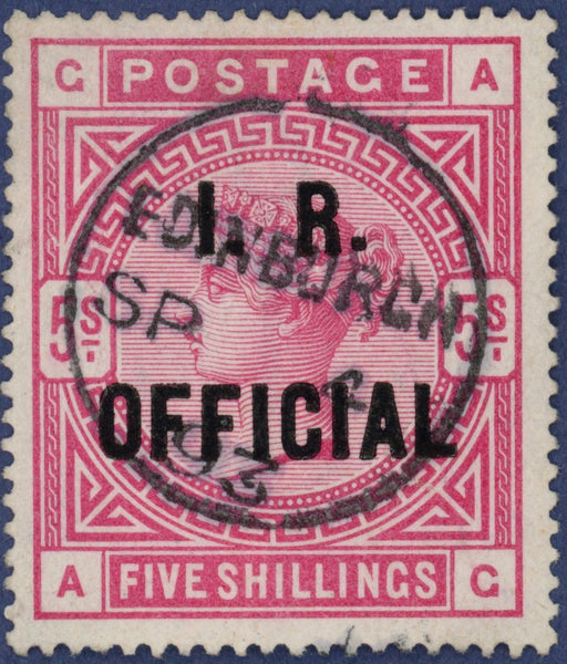 £2,500.00| /Great Britain 1890 5s rose (I.R. Official), SGO9. A very fine used example of this scarce government departmental issue lettered 'AG'. Neatly cance...