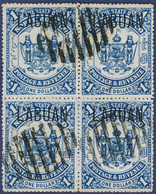 £4,000.00| /North Borneo Labuan 1904-05 $1 blue, type 21 local overprint, block of 4, cancelled-to-order with an oval of bars, SG139. A fine used block. Folded...