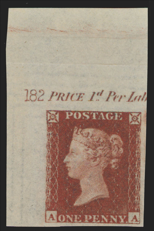 £4,000.00| /Great Britain 1854 1d red brown Plate 182 imprimatur, SG17var. A superb unused top left hand corner marginal imperforate imprimatur lettered 'AA', ...
