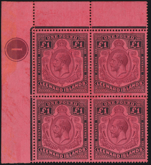 £1,500.00| /Leeward Islands 1921-32 £1 purple and black/red, SG80. A fine unmounted mint, with full original gum, ipper left corner block of 4 with plate numbe...