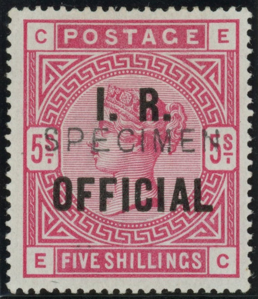 £1,400.00| /Great Britain 1890 5s rose (I.R. Official) Specimen, SGO9s. A very fine unused, with original gum, example lettered 'EC' overprinted "SPECIMEN" typ...