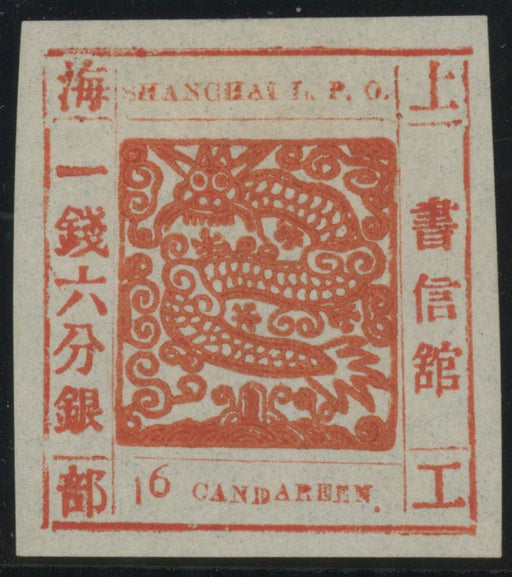 £650.00| /China 1865 (Shanghai) 16ca dull scarlet Candareen in the singular, Antique numerals, wove paper, SG 15. A fine and fresh mint example with four goo...