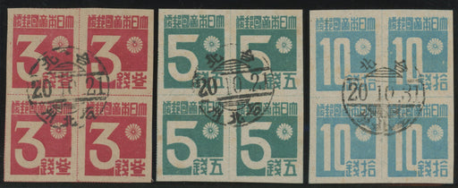 £1,200.00| /China Taiwan 1945 (Oct) ‘Numeral’ set of 3 to 10s pale blue, SGJ1/3. A fine used set, each in a block of 4 cancelled-to-order used by native Taipei...