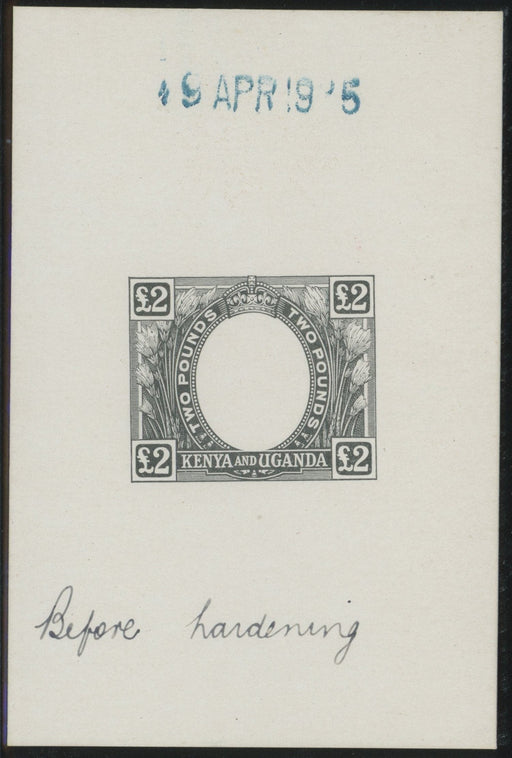 £750.00| /Kenya, Uganda and Tanganyika 1925 (19 Apr) £2 die proof of frame in black on glazed card (60x92mm), SG96. A very fine example with handstamped date...
