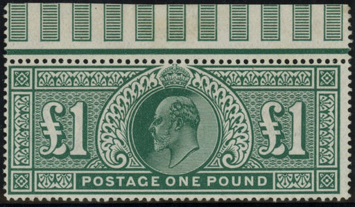 £3,000.00| /Great Britain 1911 £1 deep green, SG320. A superb unused, unmounted mint with full original gum, top marginal example printed at Somerset House. A ...