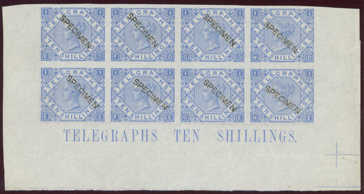 £2,500.00| /Great Britain 1877 10s Telegraphs Colour Trials Specimens, SGT16svar. A superb unmounted mint, with full original gum, block of eight lettered 'ED-...